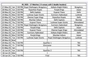 A total of 17 matches will be played across 6 venues, starting May 17, and culminating in the final on June 3.