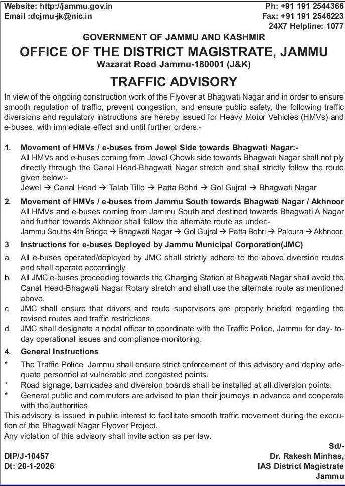 All HMVs and e-buses coming from Jammu South and destined towards Bhagwati A Nagar and further towards Akhnoor shall follow the alternate route as under:-