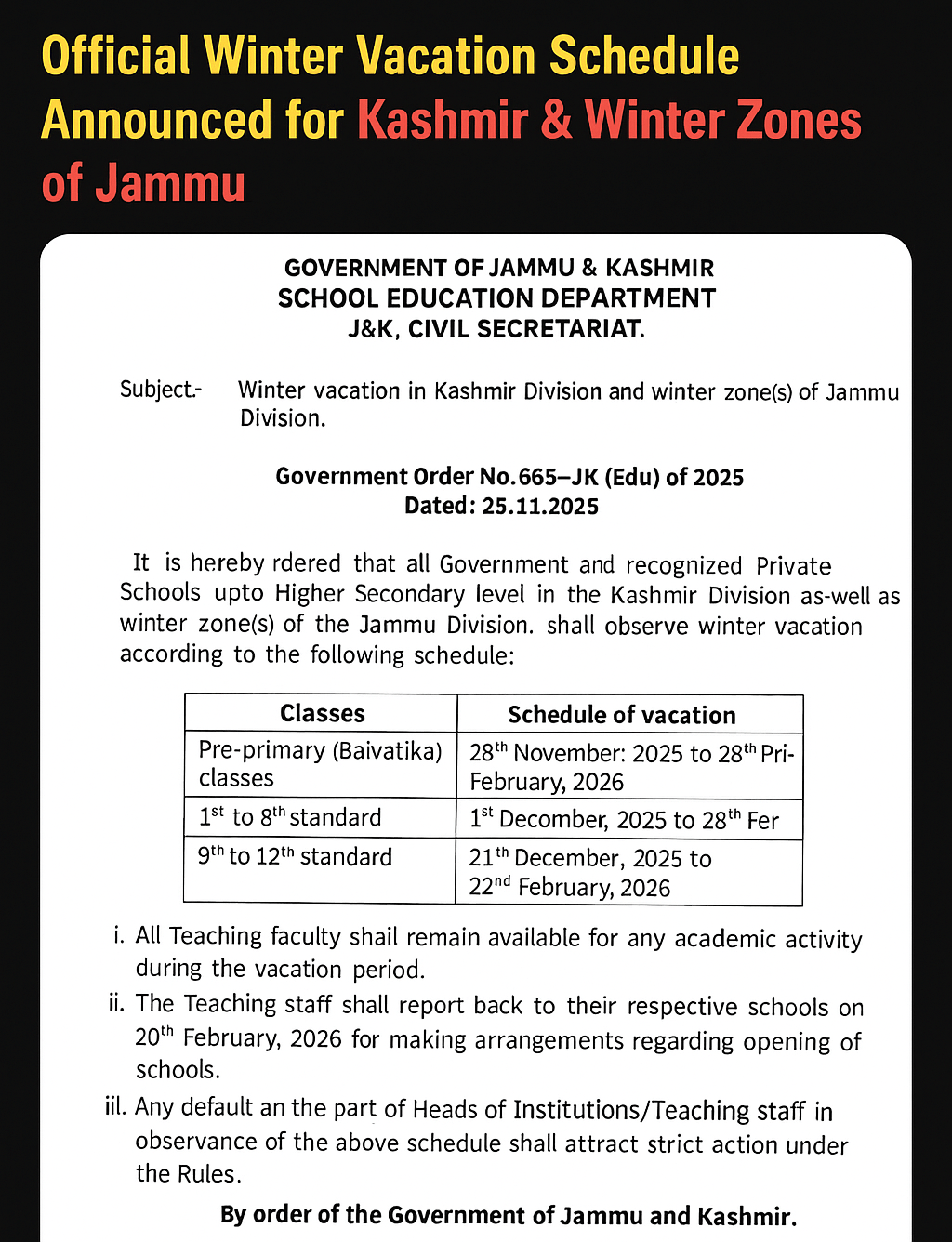 It is hereby ordered that all Government and recognized Private Schools up to Higher Secondary level in the Kashmir Division as well as winter zone(s) of the Jammu Division, shall observe winter vacation according to the following schedule: