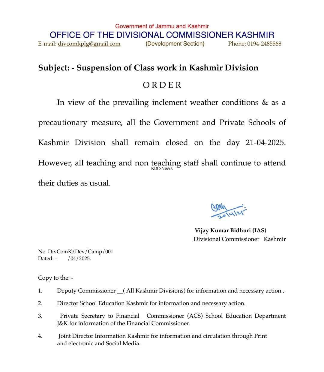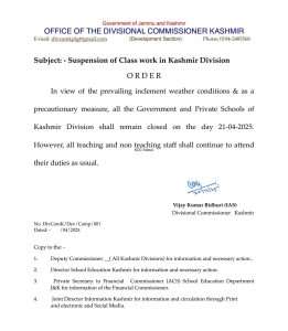 Class work in schools across Kashmir Valley to remain suspended on April 21 : Kashmir News