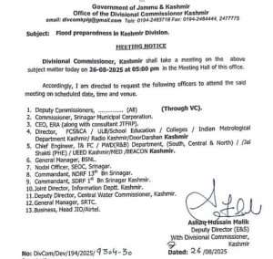 Divisional Commissioner Kashmir to review flood preparations in Kashmir today on 26.08.2025 at 05:00 PM.