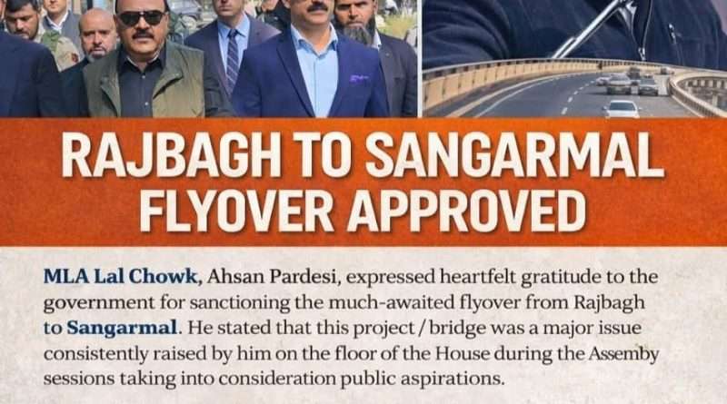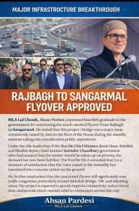 MLA Lal Chowk, Ahsan Pardesi, expressed heartfelt gratitude to the government for sanctioning the much-awaited flyover from Rajbagh to Sangarmal. He stated that this project/bridge was a major issue consistently raised by him on the floor of the House during the Assembly sessions, taking into consideration public aspirations.