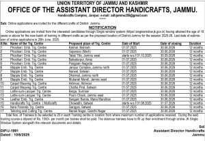 years or above for the new batch of training in different crafts as per the proposed location of District Jammu for the session 2025-26. Last date of submission of online applications is 20th June, 2025.