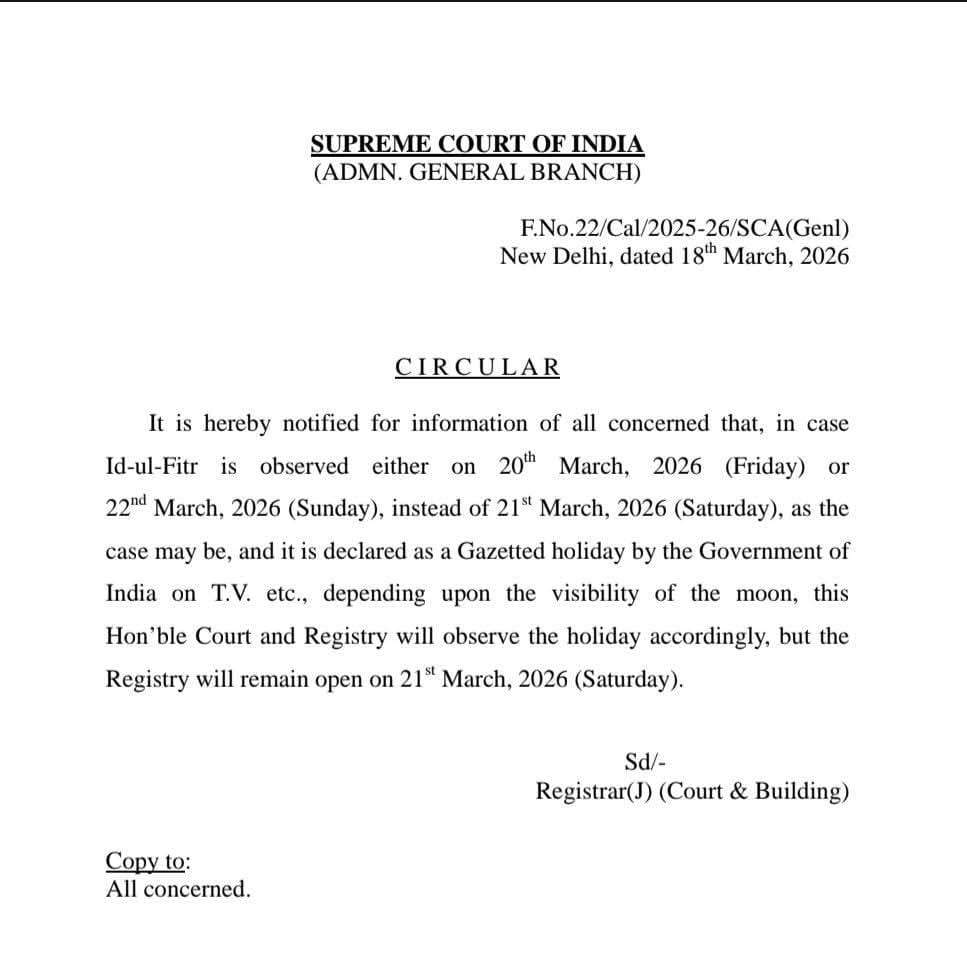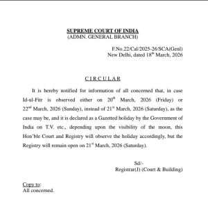 Holiday on account of Eid-ul-Fitr 2026: by order of Hon’ble Supreme Court of India