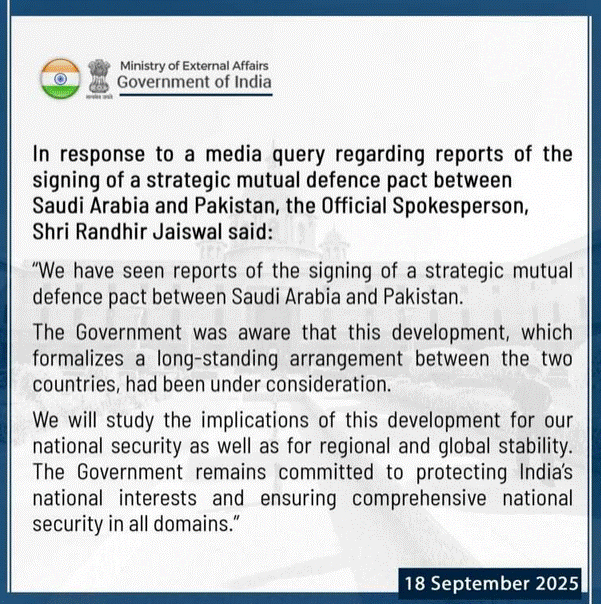 In response to a media query regarding reports of the signing of a strategic mutual defence pact between Saudi Arabia and Pakistan, the Official Spokesperson, Shri Randhir Jaiswal said: