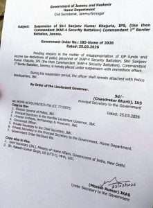 The Jammu and Kashmir Government has placed IPS officer Sanjeev Kumar Khajuria under suspension with immediate effect pending an inquiry into the alleged misappropriation of GP funds and income tax deductions of police personnel of JKAP-4 Security Battalion.