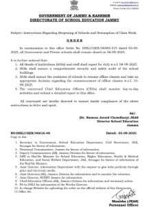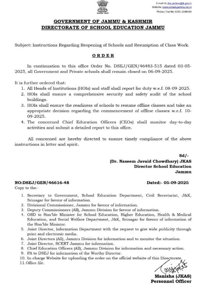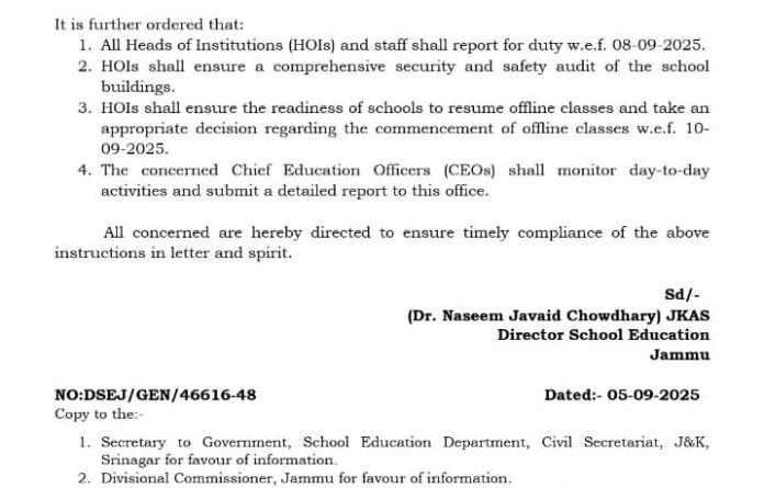 The Directorate of School Education Jammu has announced that offline classes in all Government and private schools will resume from September 10.