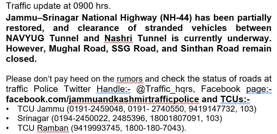 Tomorrow, vehicular movement is likely to be allowed from Nagrota (Jammu) towards Doda, Ramban, Banihal, Srinagar and vice-versa, subject to road clearance.