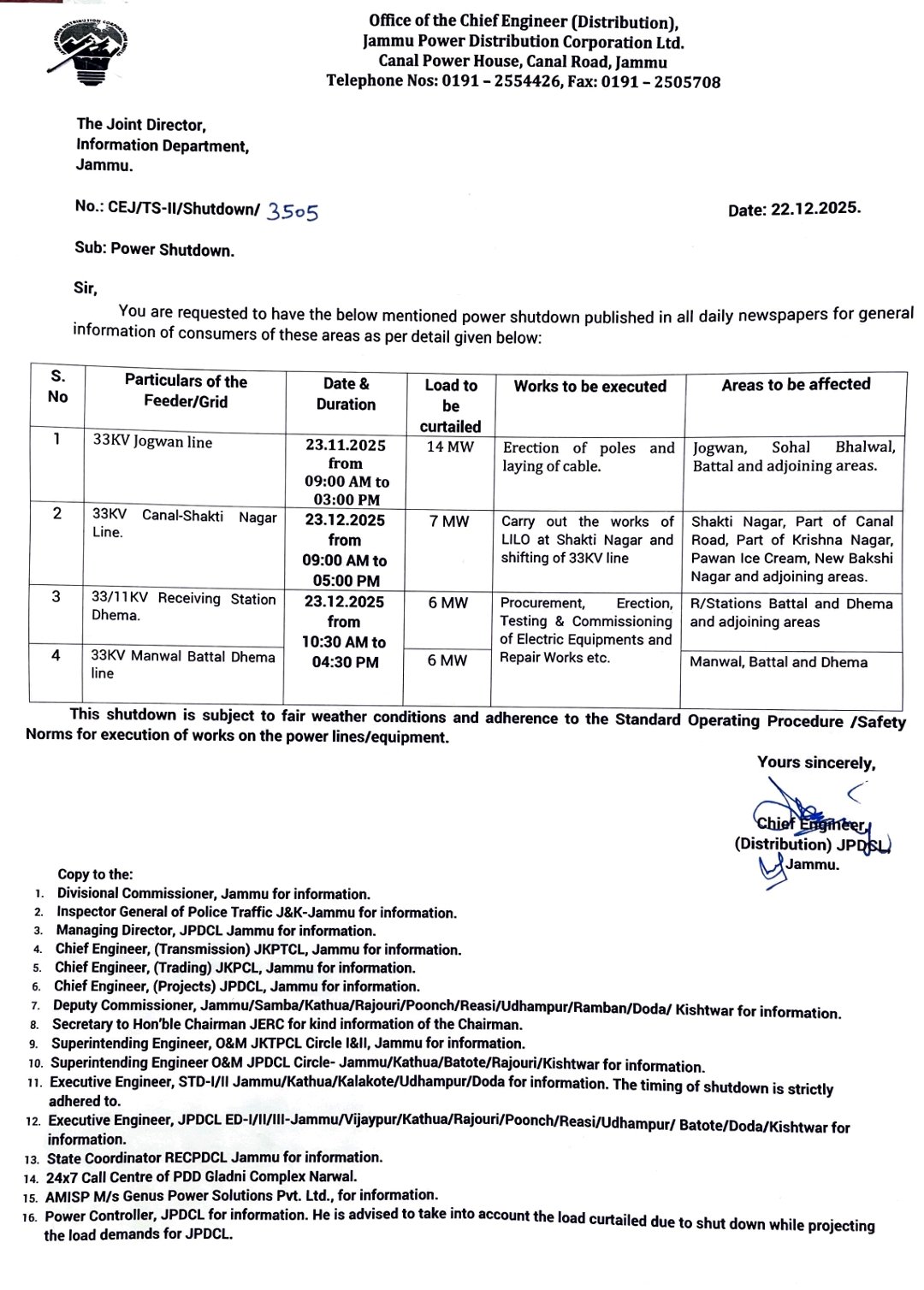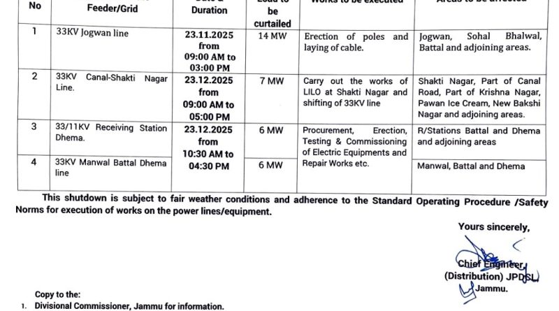Similarly, shutdown of 33 KV Wanpoh Ashajipora and Wanpoh Malaknag line will be observed due to which power supply to Ashajipora, Dialgam, Malaknag, Hazratbal, Brakpora, Doonipawa and adjoining areas will be affected on 23 & 25 December 2025 from 10 AM to 03 PM.