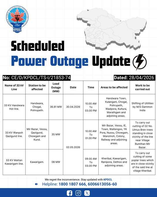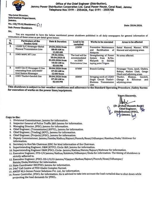 Apr 28, 2026 JK Power Shutdown Schedule For 29th April 2026 Jobs & News Desk JK Power Shutdown Schedule For 29th April 2026 Kashmir Division : Install our App & get daily FREE Mock Test Jammu Division : 👉Join JK Updates WhatsApp Channel 👈 5L+ App Installs - Trusted by Lakhs of Users - Install--> Android - IOS 👉Join Our Telegram Channel JK News TodayJammu NewsJK UT NewsKashmir News