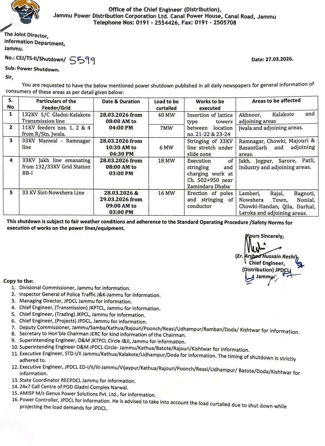 Mar 28, 2026 JK Power Shut Down, JK Power Shutdown Next Exam JK Power Shutdown Schedule For 29th March 2026 Dated: 29th March 2026 5L+ App Installs - Trusted by Lakhs of Users - Install--> Android - IOS 👉Join Our Telegram Channel JK News TodayGovernment NotificationsJammu NewsNotifications