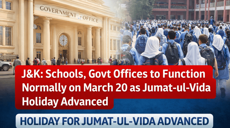 All educational institutions and government offices in Jammu and Kashmir will remain open on March 20, 2026 (Friday).