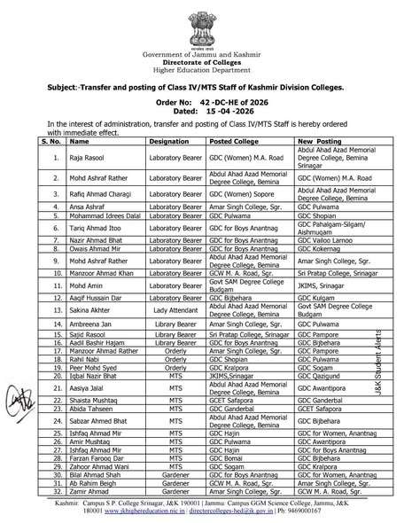 Apr 17, 2026 J&K Transfer and posting of Class IV/MTS Staff Jobs & News Desk J&K Transfer and posting of Class IV/MTS Staff Transfer and posting of Class IV/MTS Staff of Kashmir Division Colleges. POWERGRID 600+ Recruitment, CTC 12Lakh+ 👉Join JK Updates WhatsApp Channel 👈 5L+ App Installs - Trusted by Lakhs of Users - Install--> Android - IOS 👉Join Our Telegram Channel JK News TodayJammu NewsJK UT NewsKashmir News