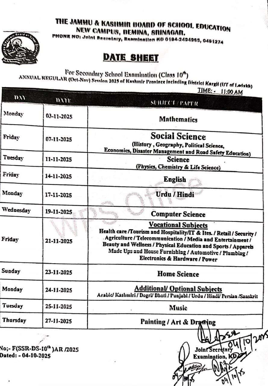 The Jammu & Kashmir Board of School Education (JKBOSE) has released the Class 10th Annual Regular 2025 Date-Sheet for Kashmir, Ladakh & Winter Zone Jammu.