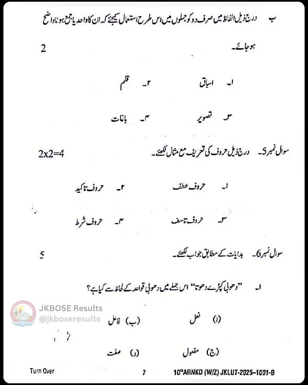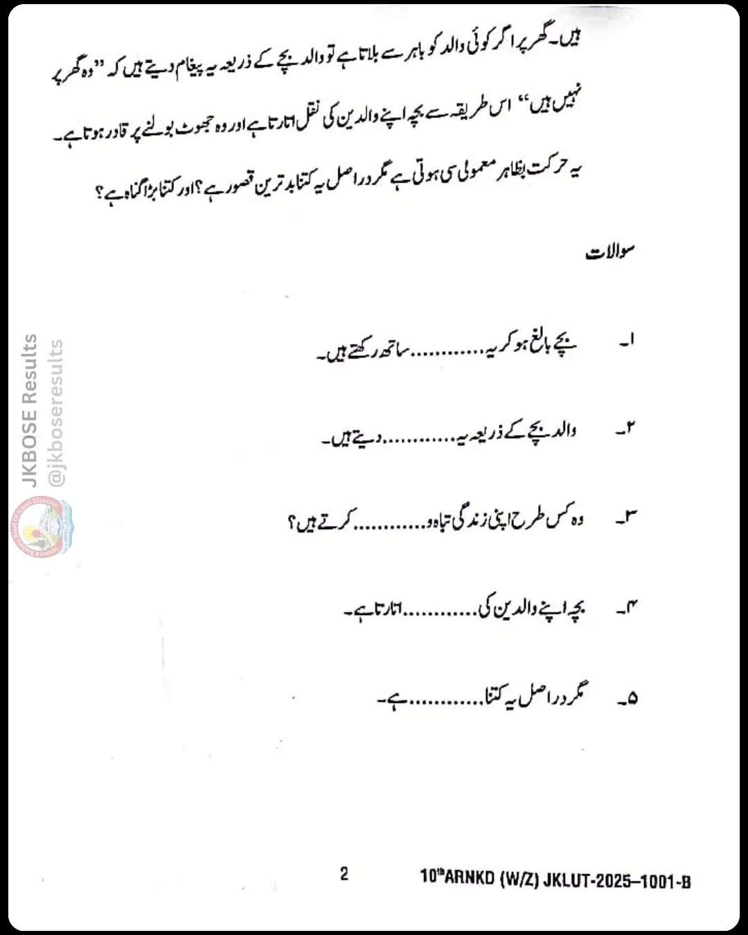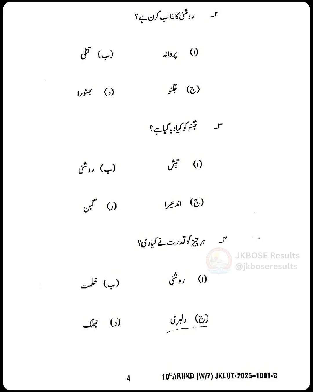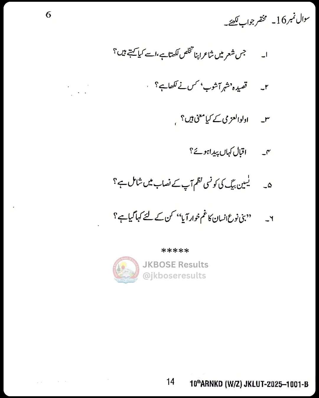 JKBOSE Class 10th Question Paper Download – Subject Urdu