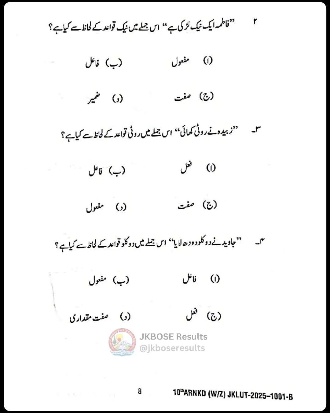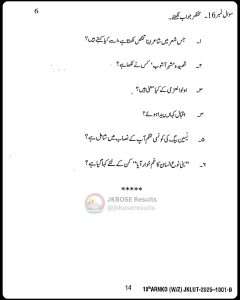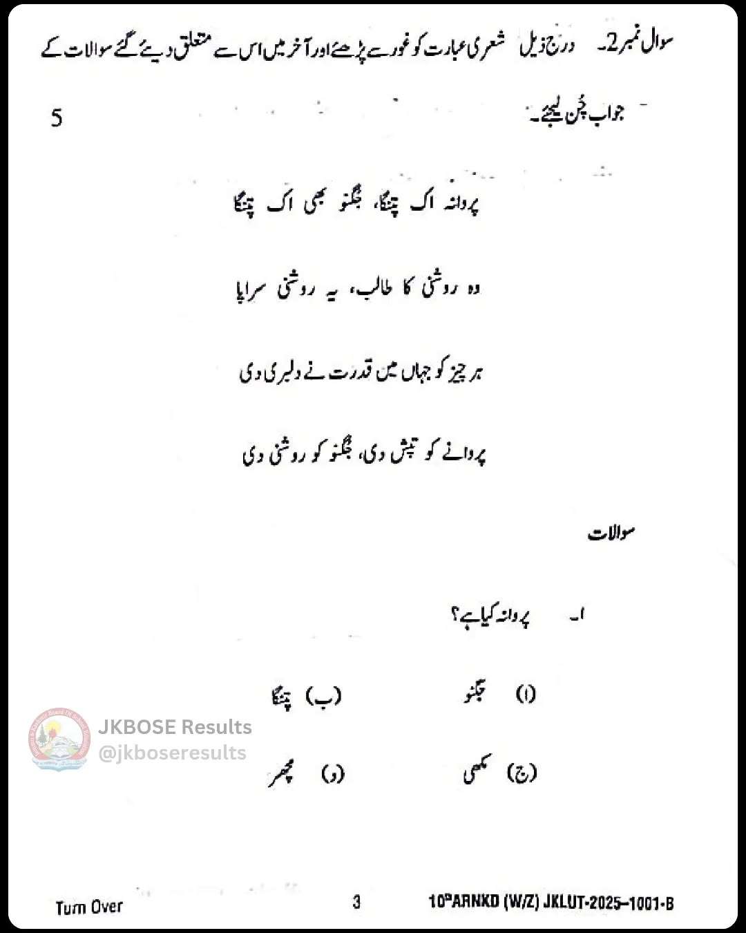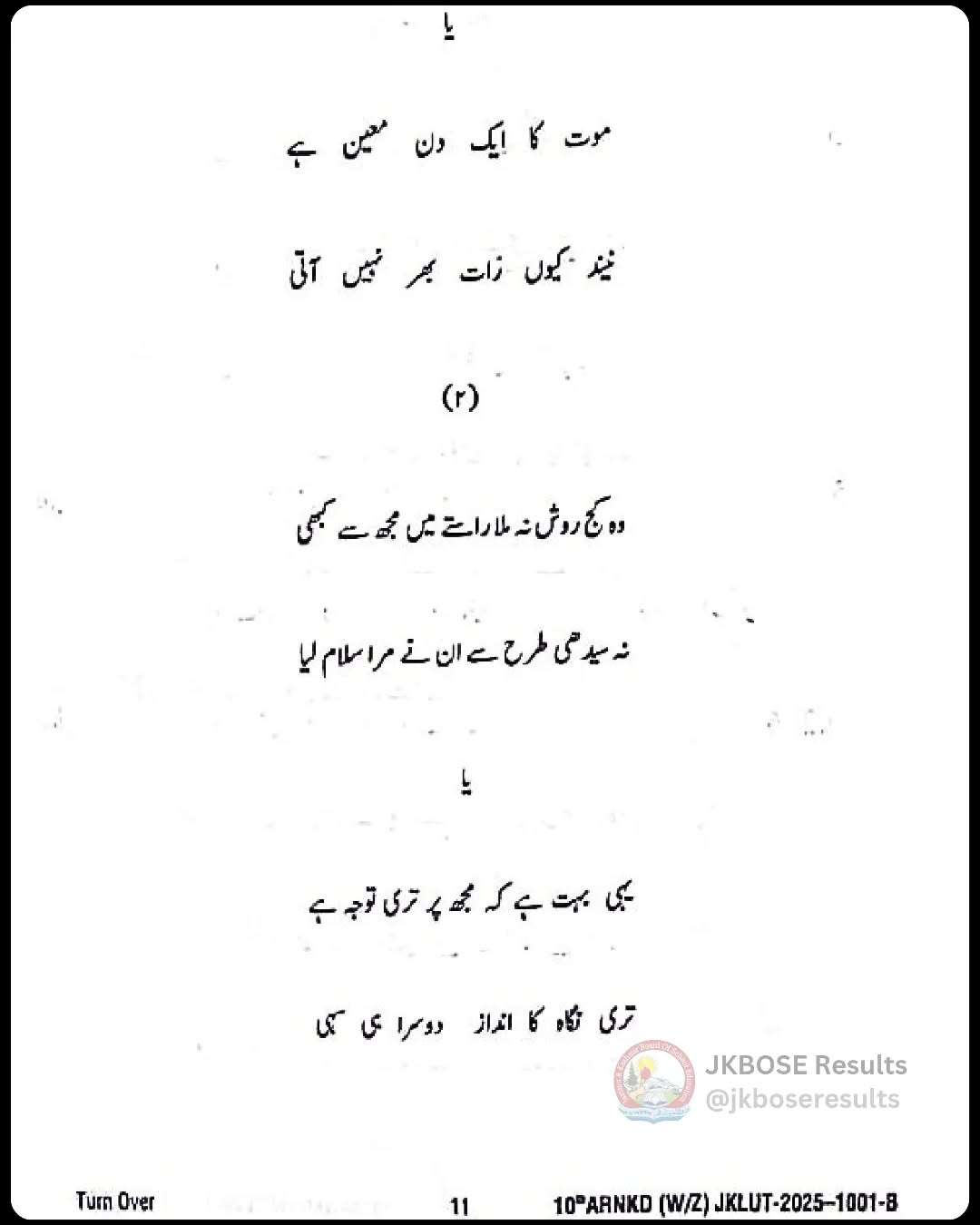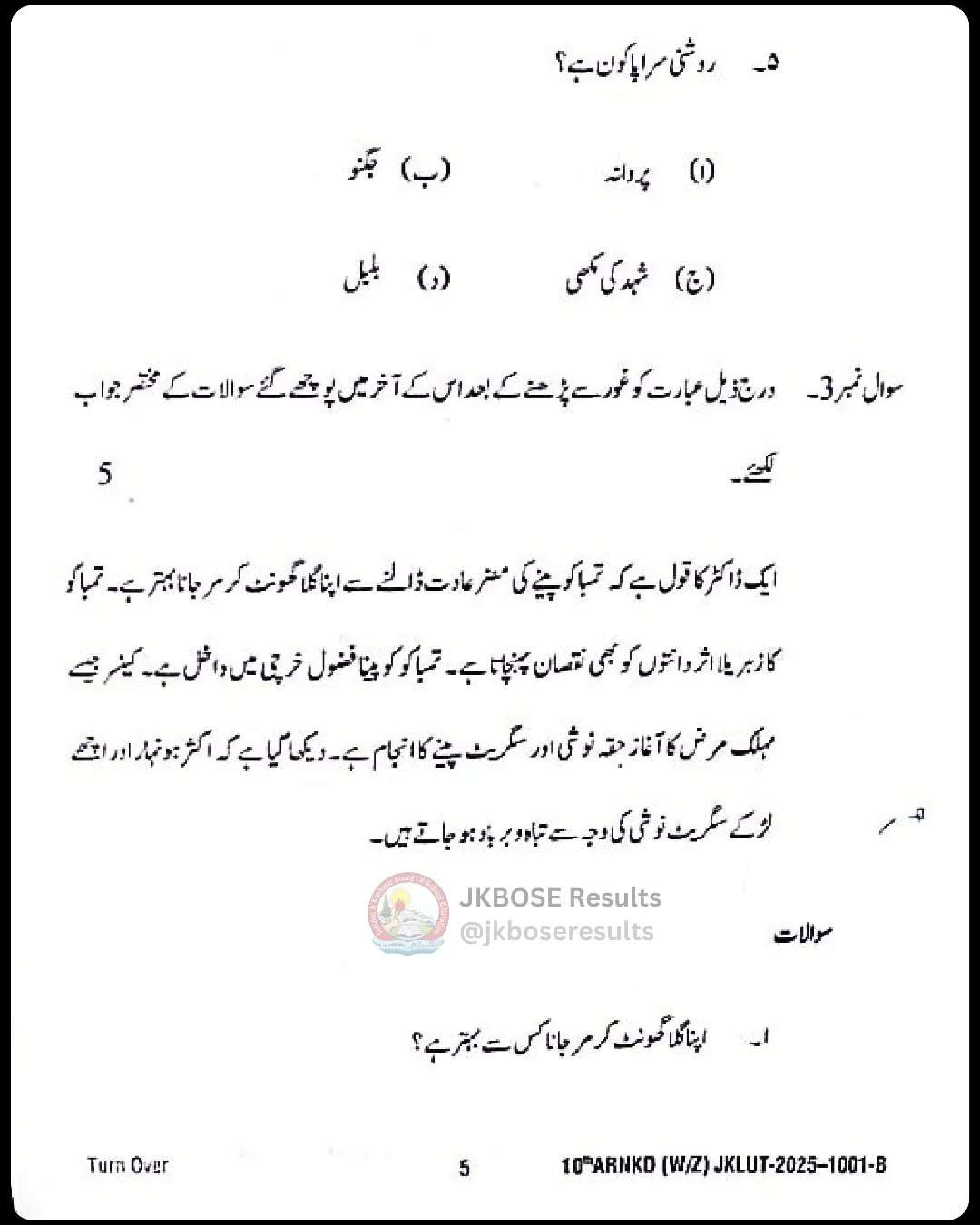 JKBOSE Class 10th Question Paper Download – Subject Urdu