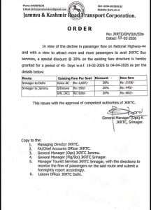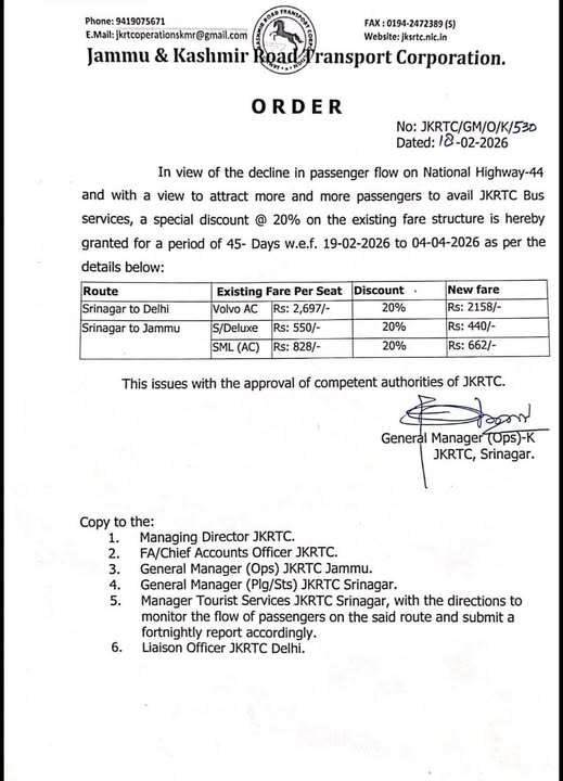 JKRTC Grant of 20% Fare Discount on JKRTC Bus Services for 45 Days (NH-44 Routes)