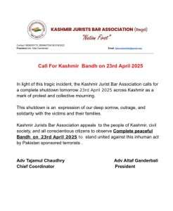 Kashmir Jurists Bar Association appeals to the people of Kashmir, civil society, and all conscientious citizens to observe Complete peaceful Bandh on 23rd April 2025 to stand united against this inhuman act by Pakistan sponsored terrorists .