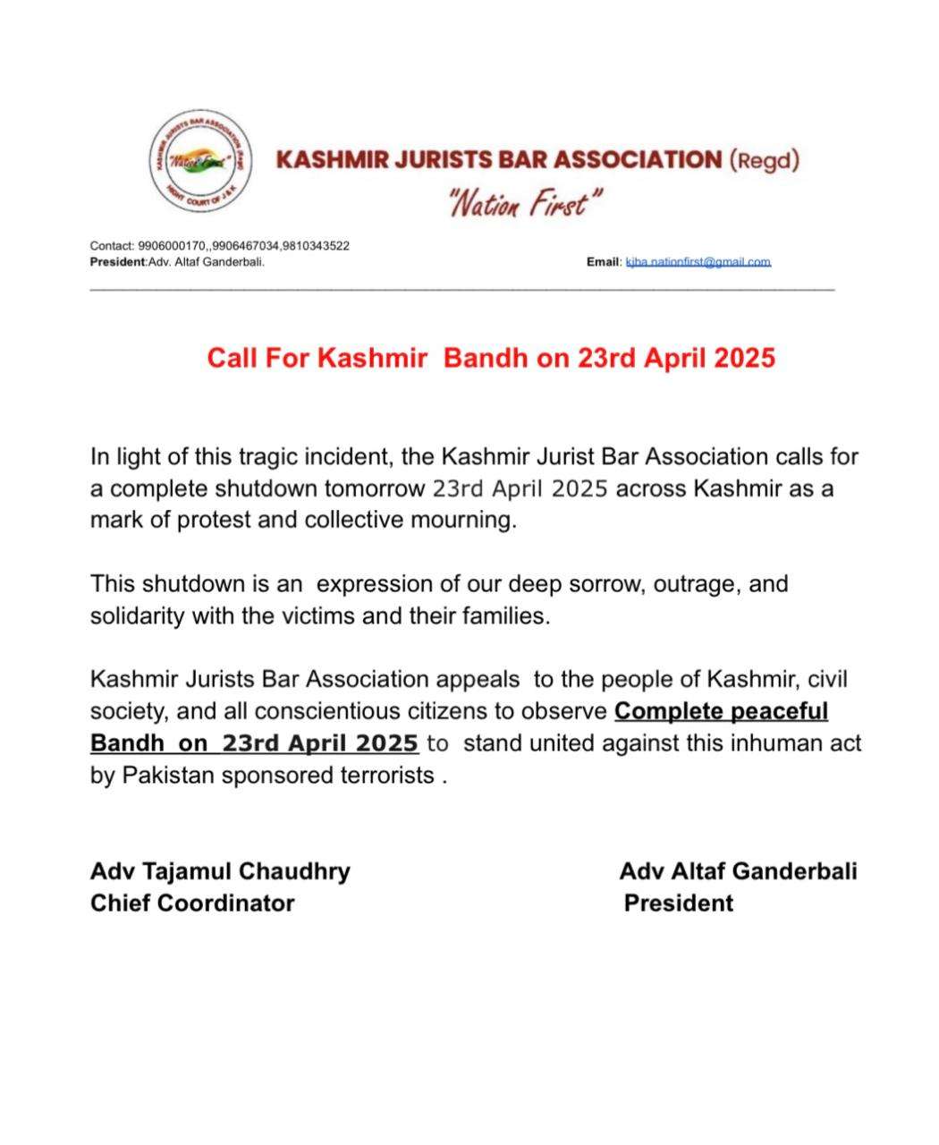 In light of this tragic incident, the Kashmir Jurist Bar Association calls for a complete shutdown tomorrow 23rd April 2025 across Kashmir as a mark of protest and collective mourning.