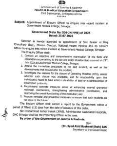 The Government of Jammu and Kashmir has appointed Baseer ul Haq Chaudhary, Mission Director, National Health Mission J&K, as the Enquiry Officer to investigate the recent law and order incident that occurred on July 23 at Government Medical College (GMC) Srinagar.