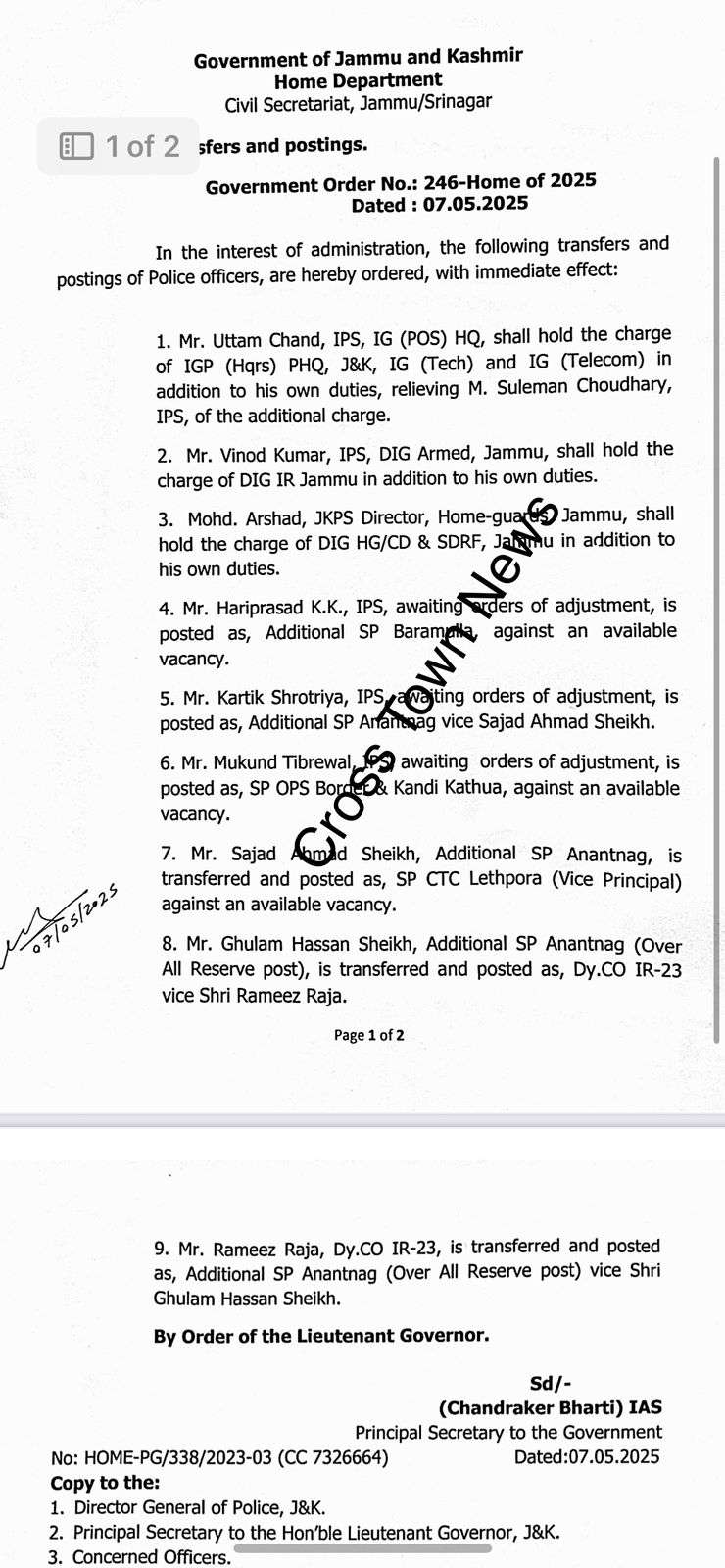 Β LG J&K Manoj Sinha ordered Transfers and postings of Police Officers including IPS Officers.