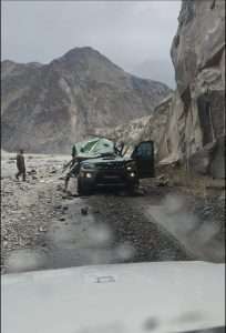 An official told news agency , that an Army vehicle was hit by the boulder when an Army convoy was moving from Durbuk to Chongtash at around 11:30 am.