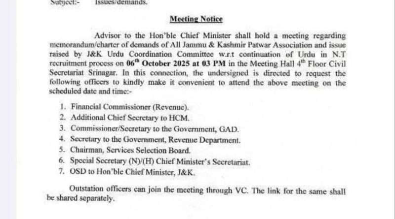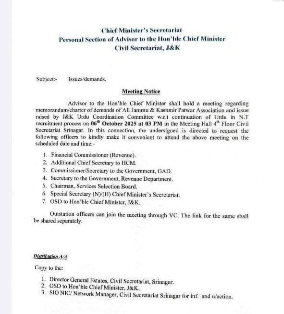 Advisor to the Hon’ble Chief Minister shall hold a meeting regarding memorandum/charter of demands of All Jammu & Kashmir Patwar Association and issue raised by J&K Urdu Coordination Committee with respect to continuation of Urdu in N.T recruitment process on 06th October 2025 at 03 PM in the Meeting Hall, 4th Floor, Civil Secretariat, Srinagar.