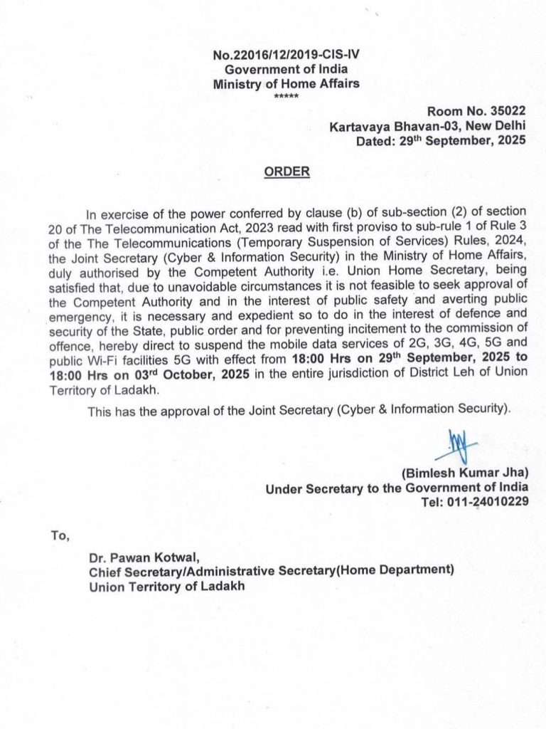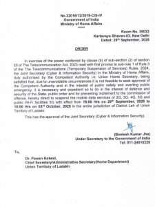 The Ministry of Home Affairs on Tuesday ordered a complete suspension of mobile internet and public Wi-Fi services in Ladakh’s Leh district from September 29 evening till October 3, citing public safety and security concerns.