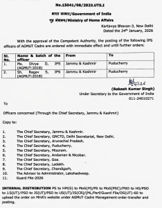 According to an official order issued by the Government of India, Divya D (AGMUT: 2018) and Ragav S (AGMUT: 2018), both presently posted in Jammu and Kashmir, have been shifted to Puducherry until further orders.