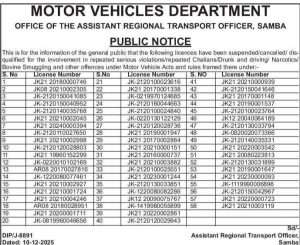 Motor Vehicle Deptt Jammu licences suspended/cancelled Notice