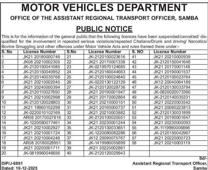 Motor Vehicle Deptt Jammu licences suspended/cancelled Notice
