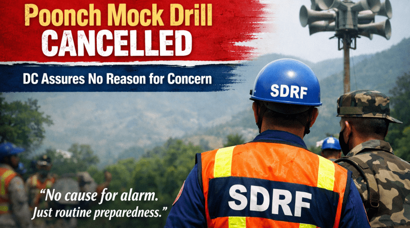 The Deputy Commissioner of Poonch on Sunday announced the cancellation of the scheduled Civil Defence mock drill in the district, assuring the public that there is no reason for concern as the exercise was part of routine preparedness activities.