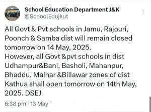 All Govt & Pvt schools in Jammu, Rajouri, Poonch & Samba dist will remain closed tomorrow on 14 May, 2025.