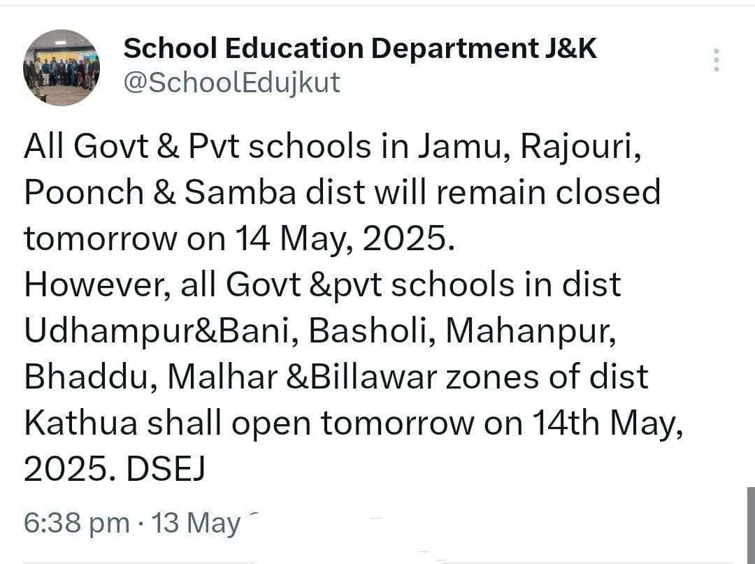 However, all Govt &pvt schools in dist Udhampur & Bani, Basholi, Mahanpur, Bhaddu, Malhar &Billawar zones of dist Kathua shall open tomorrow on 14th May, 2025. DSEJ