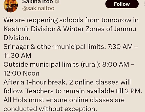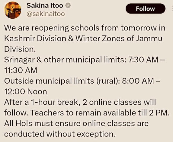 Announcing the update, Jammu and Kashmir Education Minister Sakina Itoo shared via a tweet, โWe are reopening schools from tomorrow (July 9) in Kashmir Division & Winter Zones of Jammu Division. Srinagar & other municipal limits: 7:30 am โ 11:30 am. Outside municipal limits (rural) from 8 am to 12 noon. After a 1-hour break, 2 online classes will follow. Teachers to remain available till 2 pm. All HoIs must ensure online classes are conducted without exception.โ