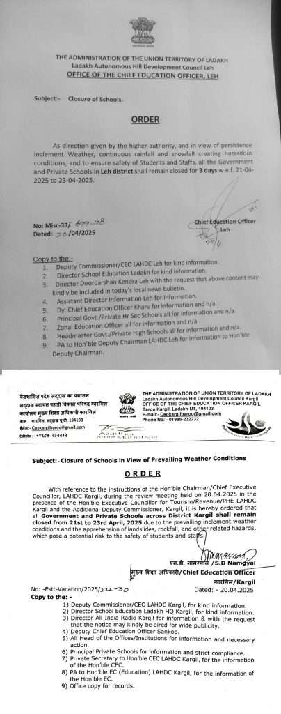 Amid ongoing inclement weather conditions, authorities have ordered the closure of all government and private schools across Leh and Kargil districts from April 21 to April 23, 2025.