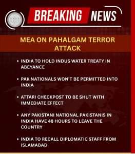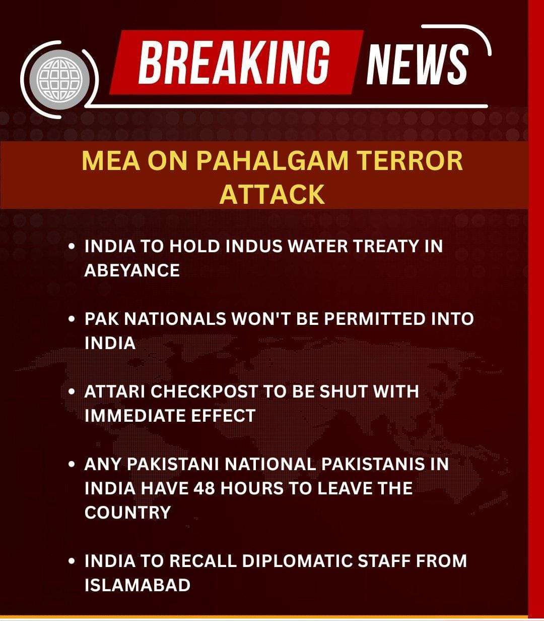 * Indus water treaty to be kept at ‘Abeyance’ * India declares Pak Defence (Military Naval and Air Advisor) in New Delhi as ‘Persona-Non-Grata’; they have a week to leave India.