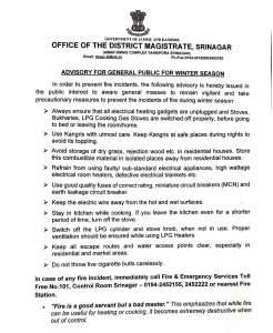 In order to prevent fire incidents, the following advisory is hereby issued in the public interest to aware general masses to remain vigilant and take precautionary measures to prevent the incidents of fire during winter season:
