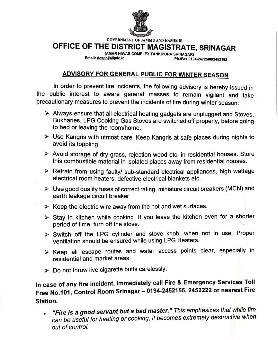 In case of any fire incident, immediately call Fire & Emergency Services Toll Free No. 101, Control Room Srinagar – 0194-2452155, 2452222 or nearest Fire Station.