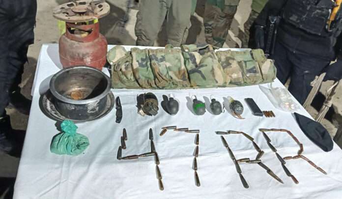 During the search, arms, ammunition and explosives were recovered from the terrorist hideout, including 34 rounds of 7.62 mm ammunition, 18 rounds of 9 mm ammunition, one pistol magazine, one Pakistani hand grenade, four Chinese grenades and one ammunition pouch.