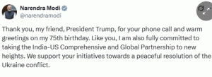 On Truth Social, Trump struck an effusive note: “Just had a wonderful phone call with my friend, Prime Minister Narendra Modi. I wished him a very Happy Birthday! He is doing a tremendous job. Narendra: Thank you for your support on ending the war between Russia and Ukraine!”