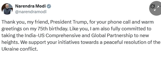 PM Modi, measured as ever, responded with a carefully crafted post on X: “Thank you, my friend, President Trump, for your phone call and warm greetings on my 75th birthday. Like you, I am also fully committed to taking the India-US Comprehensive and Global Partnership to new heights. We support your initiatives towards a peaceful resolution of the Ukraine conflict.”