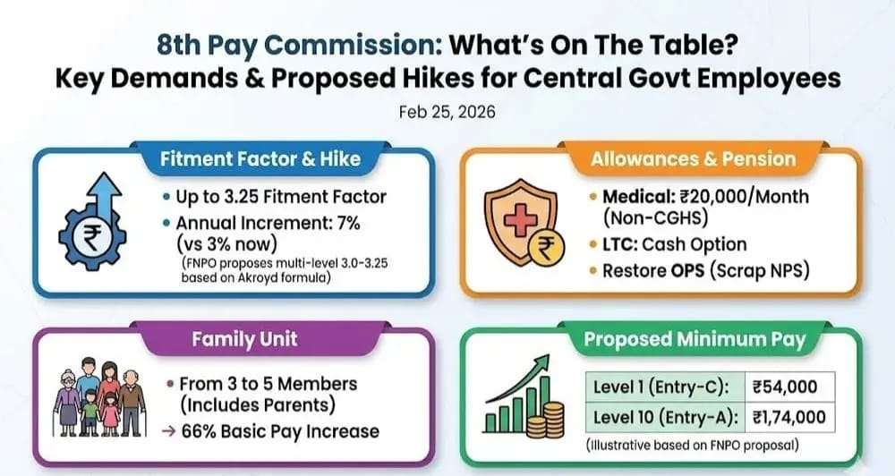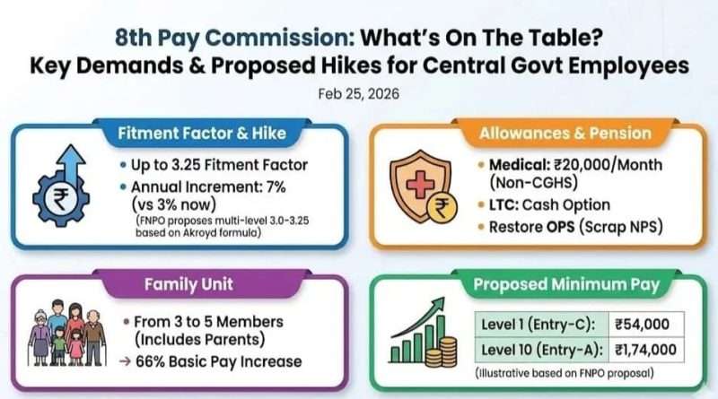 Under Fitment Factor & Salary Hike, the fitment factor may go up to 3.25. The annual increment is proposed to increase to 7% instead of the current 3%. FNPO has suggested a multi-level fitment factor ranging from 3.0 to 3.25 based on the Aykroyd formula.