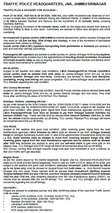 As per order issued by the SDM Chatroo vide No. SDM/CC/2025-27 dated 13-04-2026, the SDM Kokernag vide No. SDM/KG/2025-26/981 dated 14-04-2026, subject to fair weather and good road condition, passenger traffic including HMVs shall be allowed to ply from Kishtwar towards Ahlan–Sinthan Top. These vehicles shall be allowed from Kishtwar between 1000 hrs to 1500 hrs. No vehicle shall be allowed after cut-off timing. TCU Jammu/Ramban/TCU Srinagar will inform all concerned about the cut-off timing.