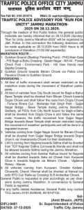 General Public is requested to plan accordingly as per diversions during Jammu Marathon. In convenience to General Public is regretted.