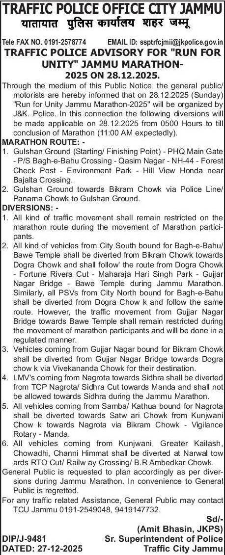 Through the medium of this Public Notice, the general public/ motorists are hereby informed that on 28.12.2025 (Sunday) “Run for Unity Jammu Marathon-2025” will be organized by J&K. Police.