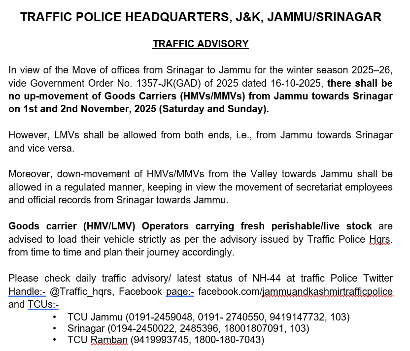 In view of the Move of offices from Srinagar to Jammu for the winter season 2025β26, vide Government Order No. 1357-JK(GAD) of 2025 dated 16-10-2025, there shall be no up-movement of Goods Carriers (HMVs/MMVs) from Jammu towards Srinagar on 1st and 2nd November, 2025 (Saturday and Sunday).