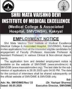 Job Recruitment in Shri Mata Vaishno Devi Institute of Medical Excellence