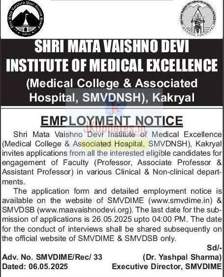 Shri Mata Vaishno Devi Institute of Medical Excellence (Medical College & Associated Hospital, SMVDNSH), Kakryal invites applications from all the interested eligible candidates for engagement of Faculty (Professor, Associate Professor & Assistant Professor) in various Clinical & Non-clinical departments.