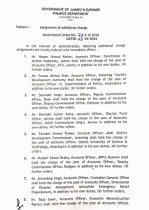 1.) Mr. Naseer Ahmad Rather, Accounts Officer, Directorate of Animal Husbandry, Jammu shall hold the charge of the post of Accounts Officer, RTO, Jammu in addition to his own duties, till further orders.
